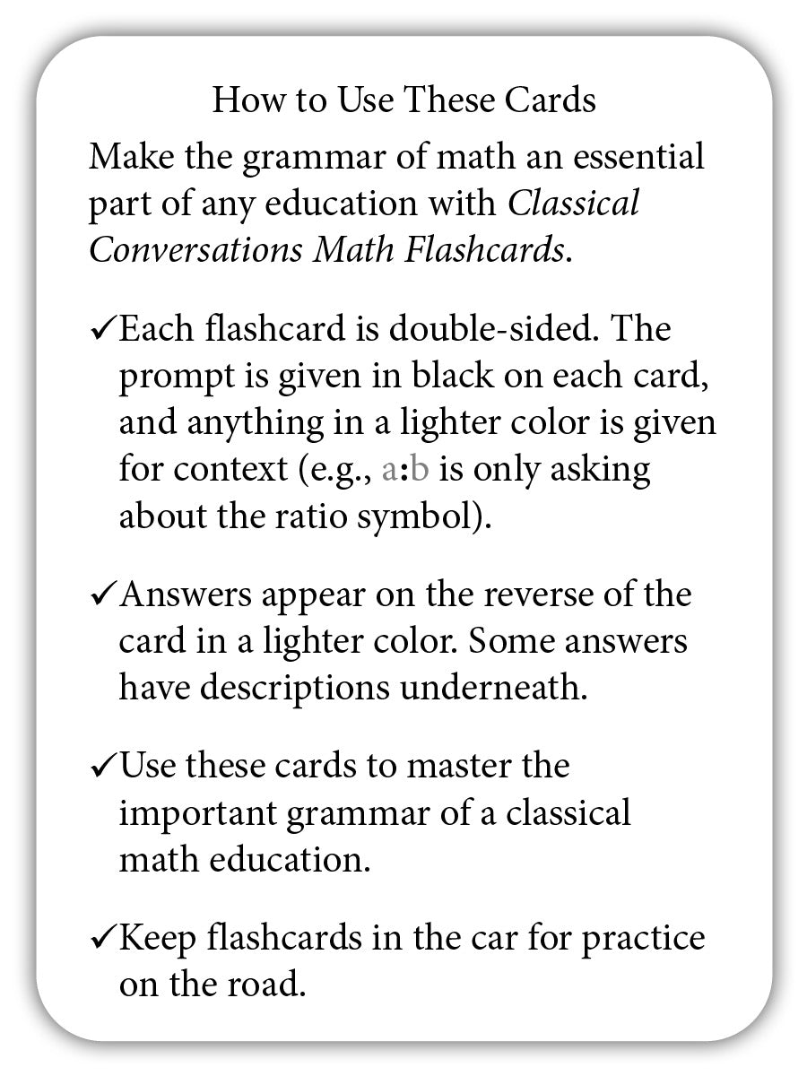 The math flashcards Algebra: Laws and Operations are designed to support families in developing fluency with the language of mathematics and agility in mental calculations and in written work.