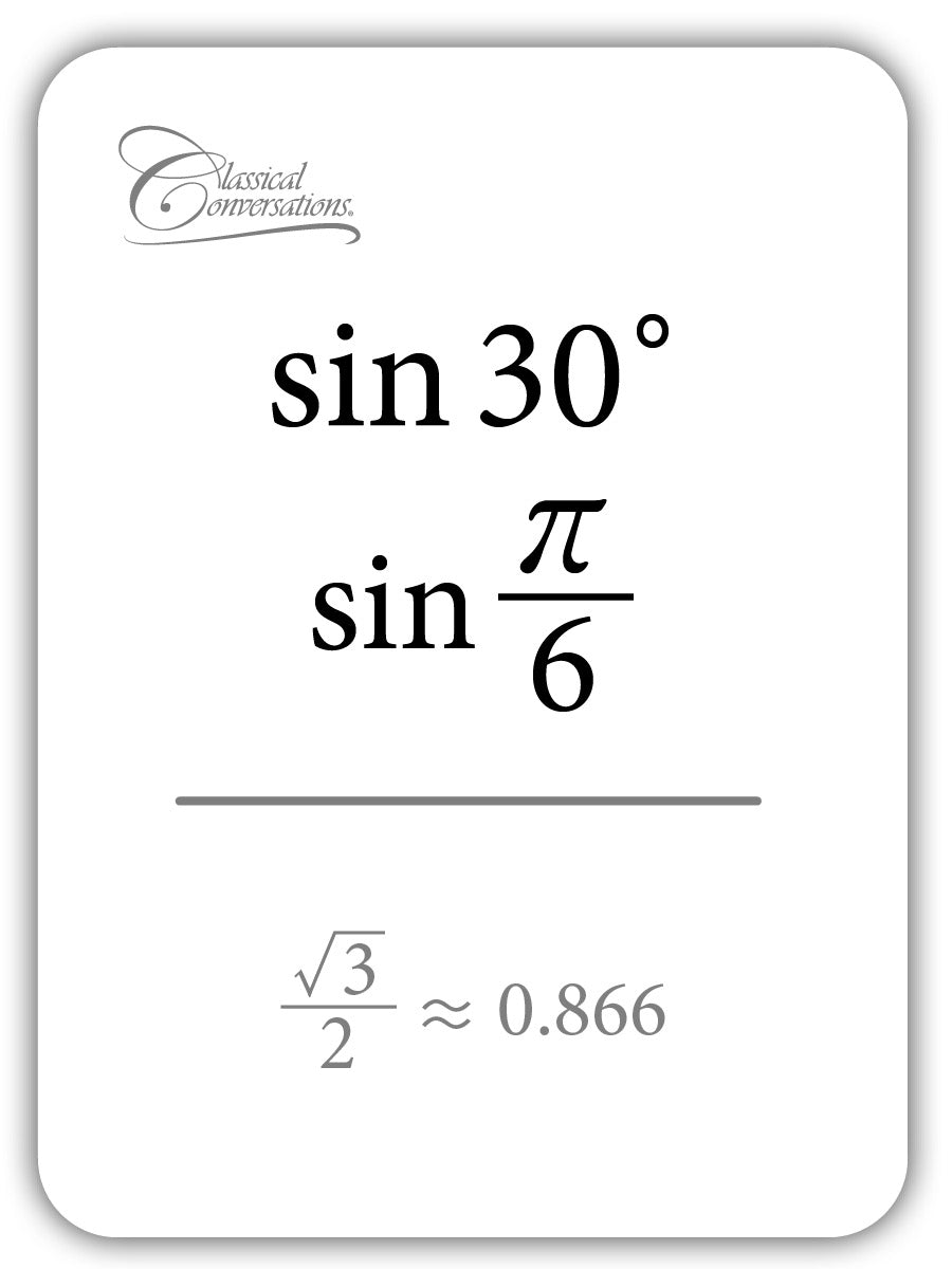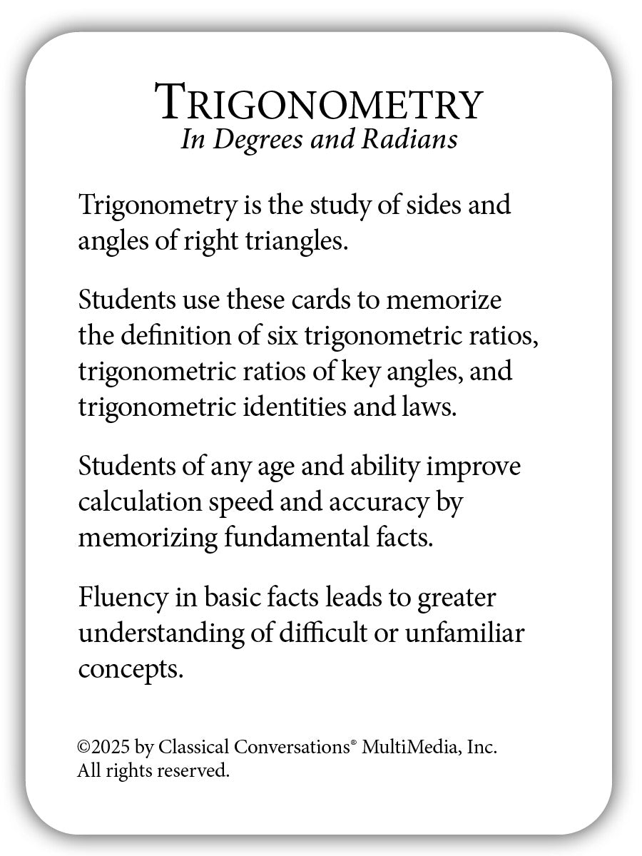 The math flashcards Trigonometry: In Degrees and Radians are designed to support families in developing fluency with the language of mathematics and agility in mental calculation and in written work.